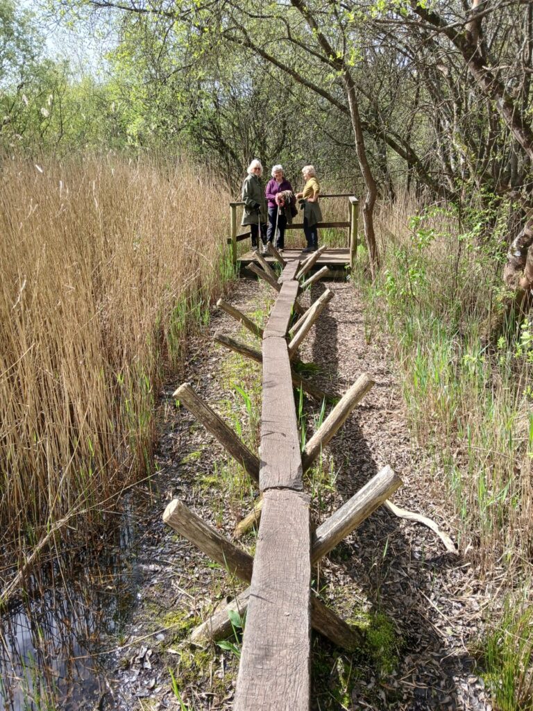 Twelve of us walked along the beautiful Sweet Track path at Shapwick Heath, passing a wobbly reconstruction of the 4000 year old Sweet Track, which some of us braved (see pic below) then on to the Decoy Hide and its view back to Glastonbury Tor over the lake, then walked to another hide near the site of a railway accident (in 1947), then back along the old railway track in the rain!
